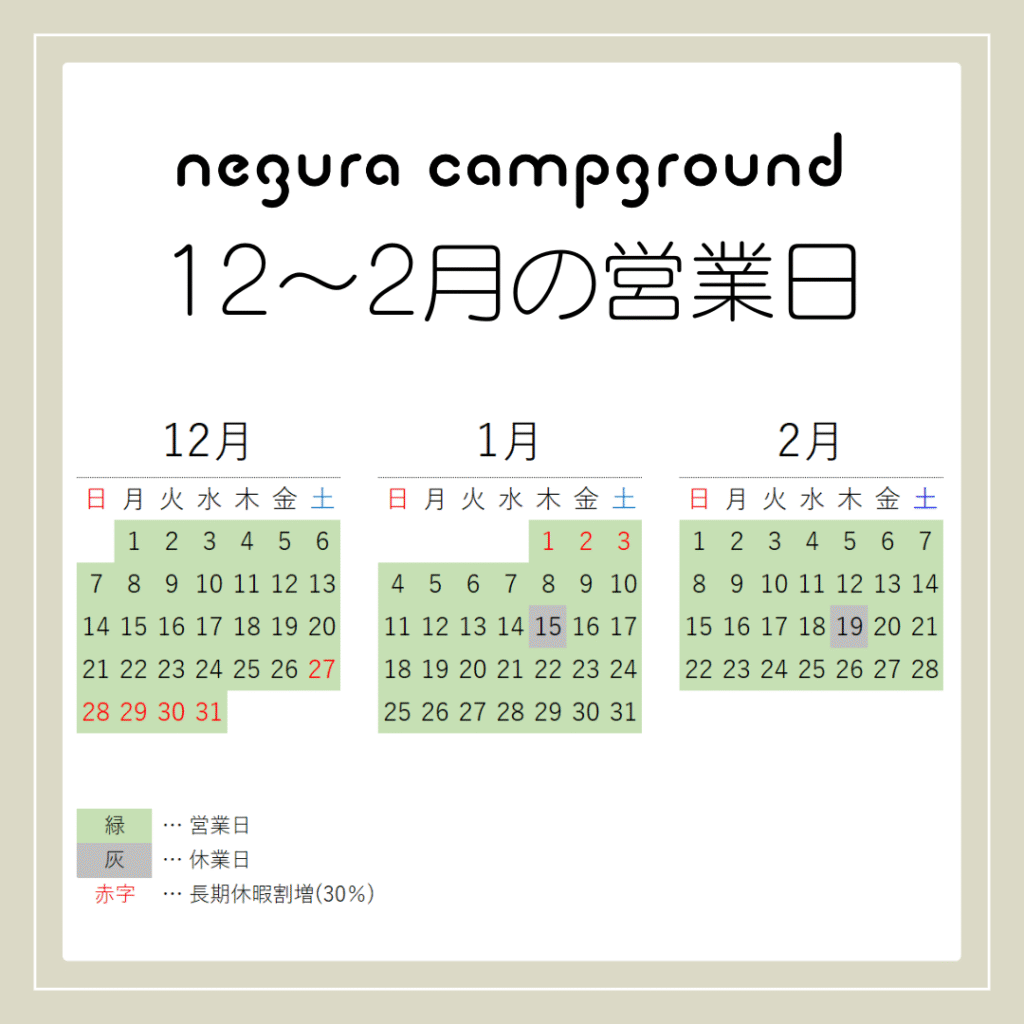 - キャンプ場づくりのために不定期で休業日を設ける場合がございます。
